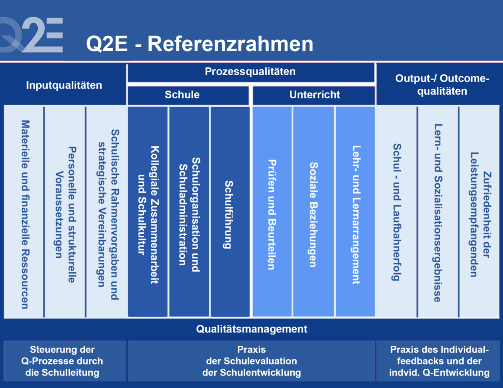 Die insgesamt 5 Bereiche und 15 Dimensionen des Q2E-Referenzrahmens bilden die Grundstruktur des Q2E-Basisinstruments. Sie machen deutlich, worauf bei einer umfassenden Wahrnehmung und Reflexion der Schulqualität die Aufmerksamkeit gelenkt werden sollte. Zudem helfen sie, die Fülle an Qualitätsmerkmalen zu ordnen, die für die Erfassung der Schulqualität bedeutsam sind.